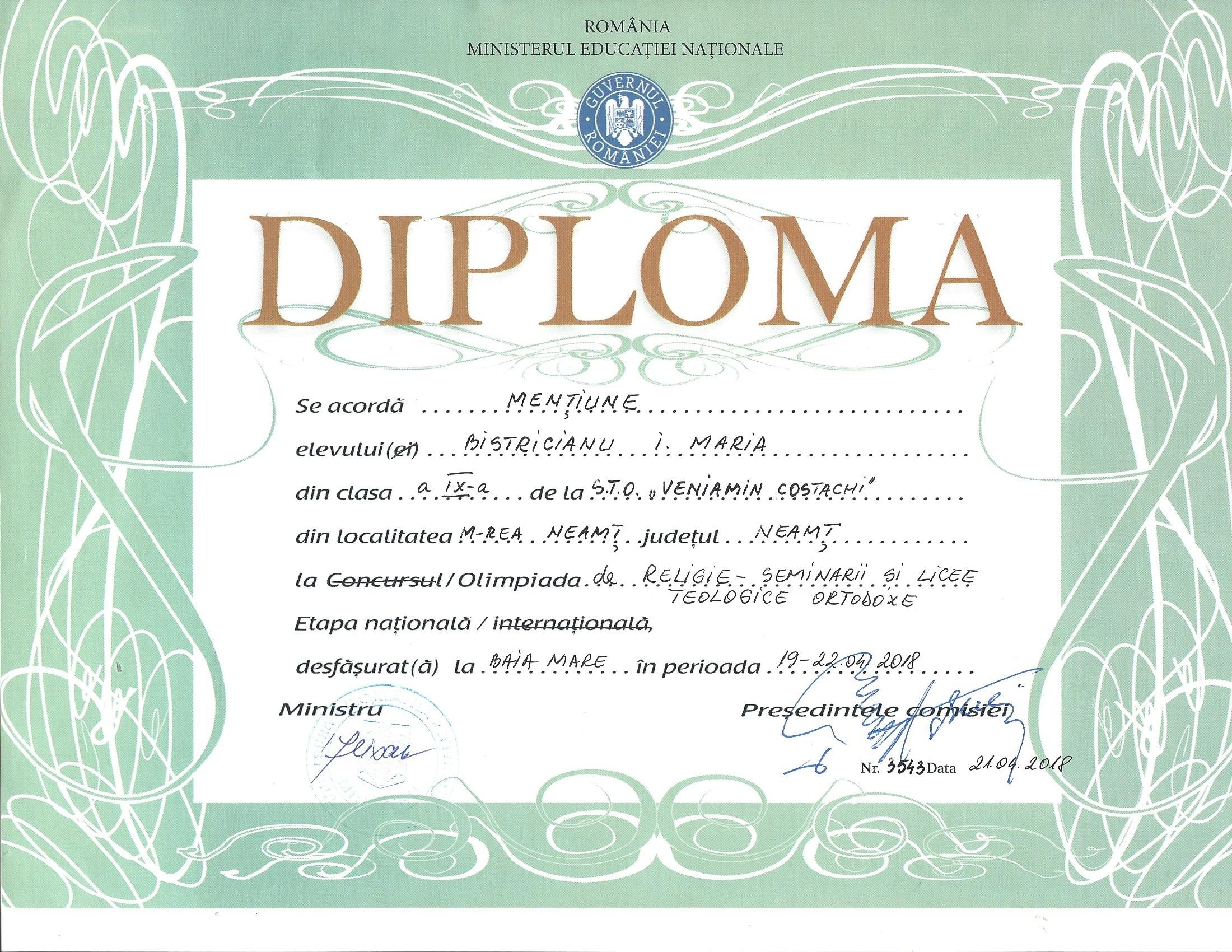 - Bistriceanu Maria, clasa a IX-a Patrimoniu, Mențiune la disciplina Noul Testament, coordonată de Diac. Prof. Ilarion Argatu