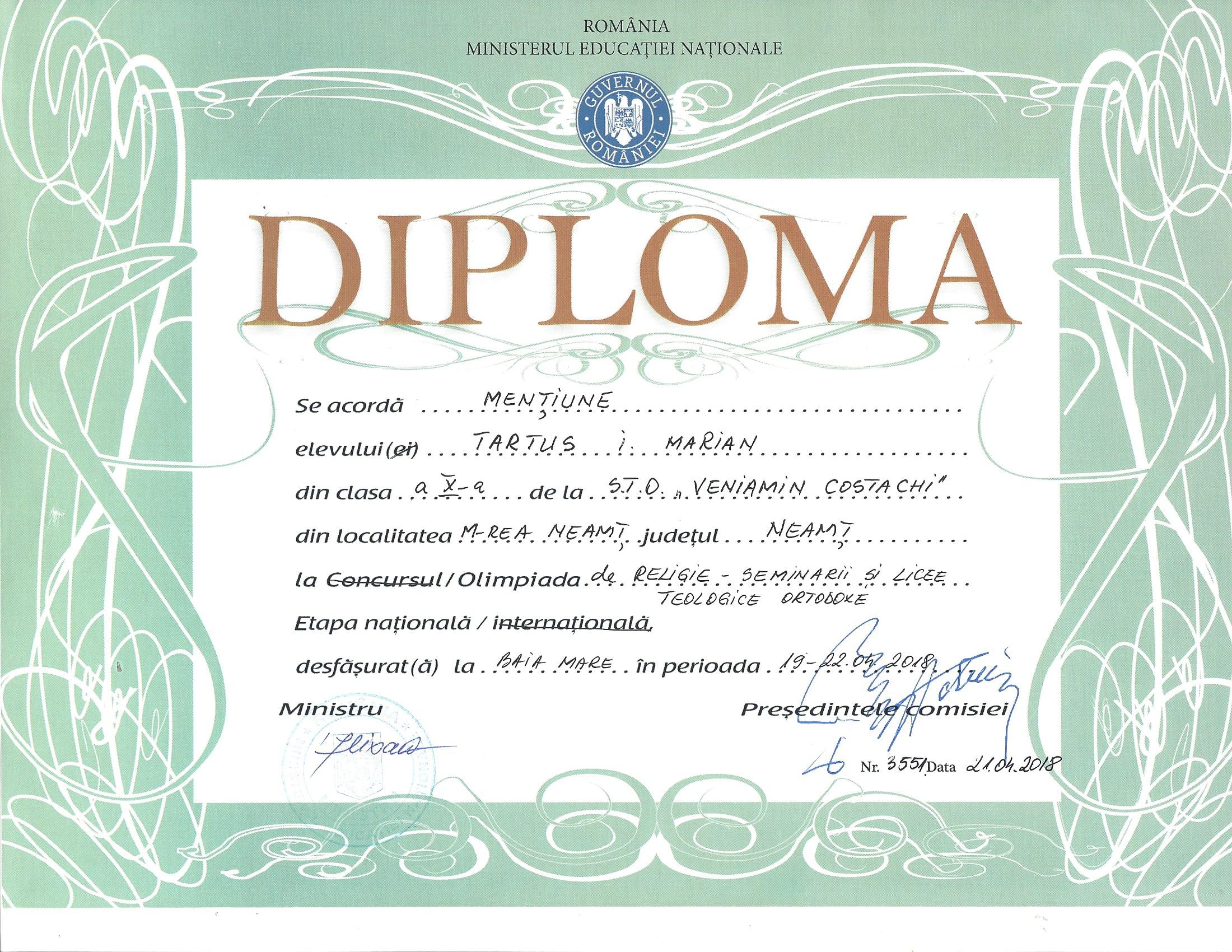 - Tartus Marian, clasa a X-a Pastorală, Mențiune la disciplina Vechiul Testament, coordonat de Pr. Prof. Dir. Adj. Viorel Laiu