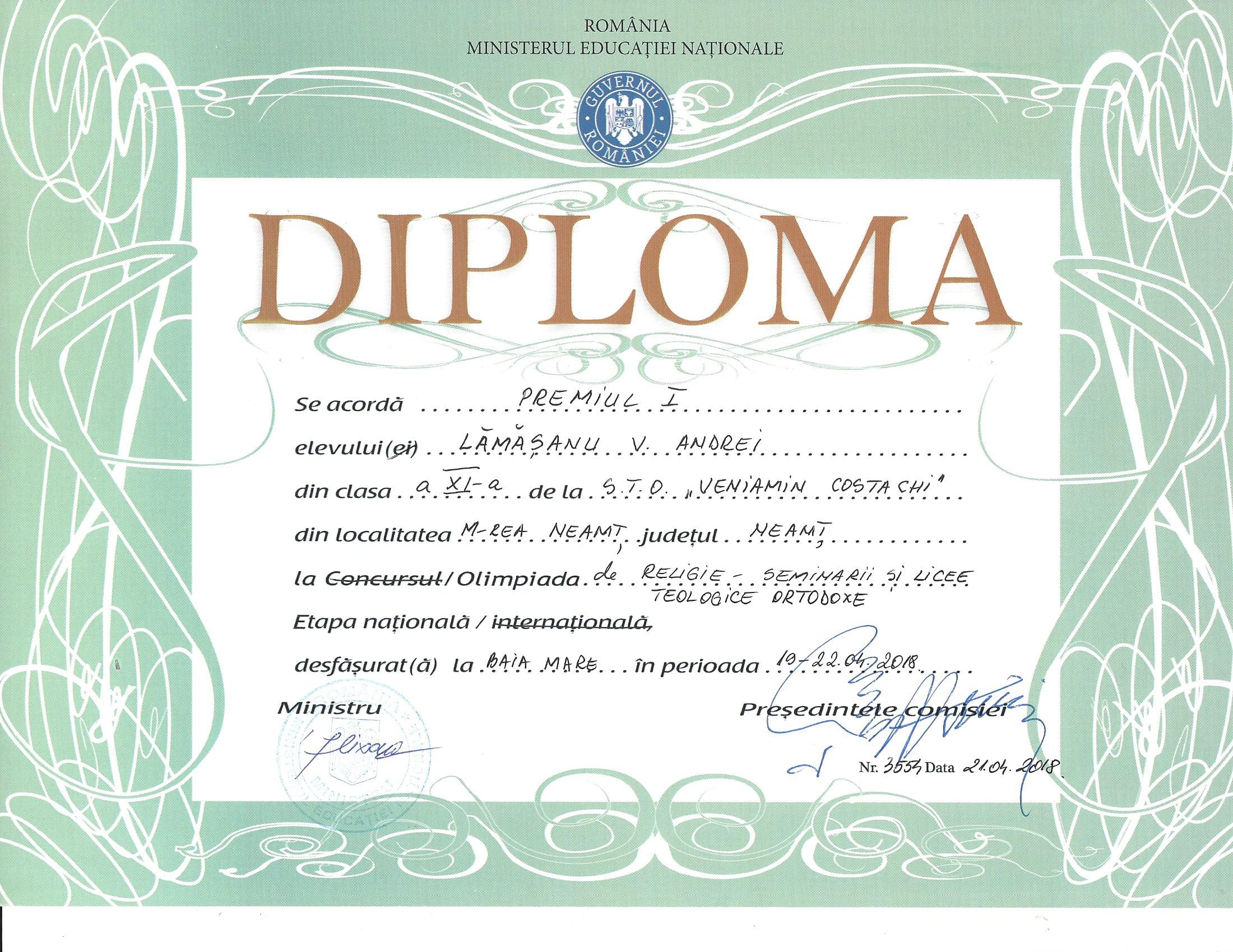 - Lămășanu Andrei, clasa a XI-a Pastorală, a primit Premiul I la disciplina Istoria Bisericii Ortodoxe Române, coordonat de Pr. Prof. Arhim. Mihail Daniliuc.