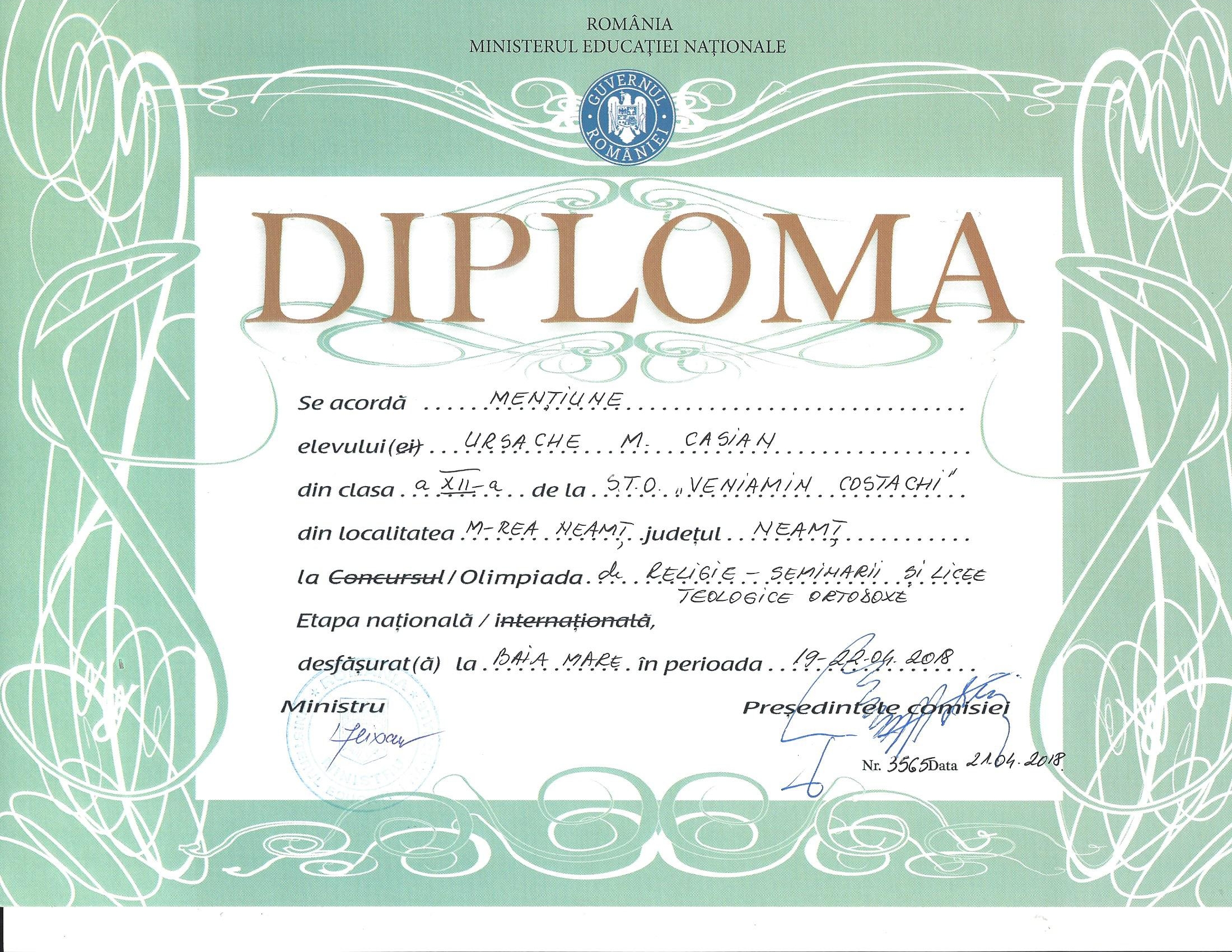 - Ursache Casian, clasa a XII-a Pastorală, Mențiune la disciplina Dogmatică Ortodoxă, coordonat de Pr. Prof. Vasile Păvăleanu